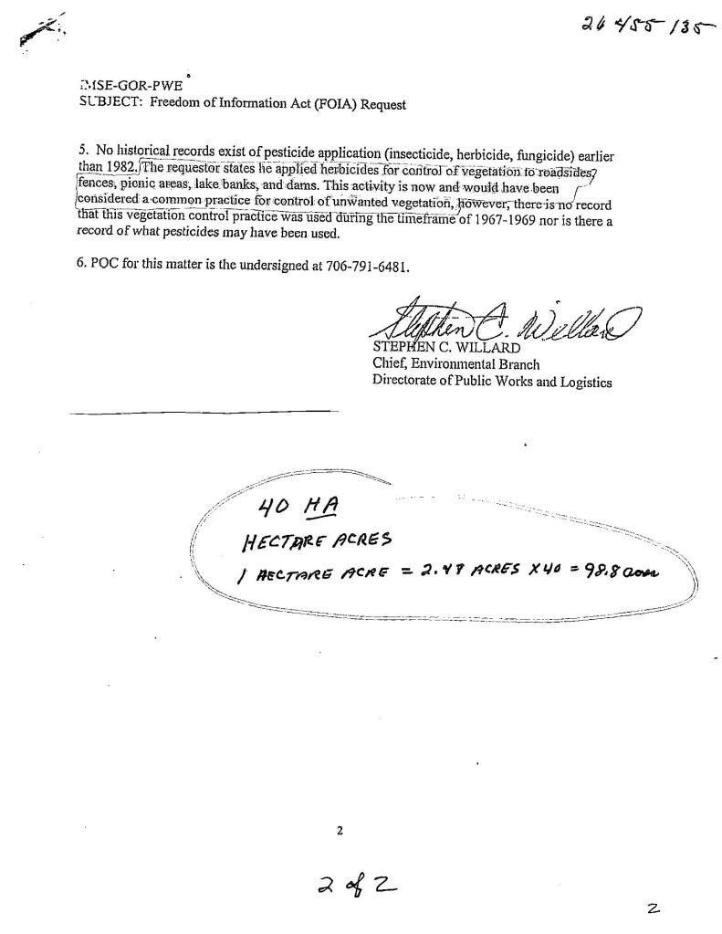 I just released the documentation that my stash of Agent Orange was found at Fort Gordon. It was there and discovered by the instillation Forester in a locked buildin on Little Beaver Pond in the mid 1980s. It just sat there for many years corroding the metal drums and leaking into the Controled Lakes.